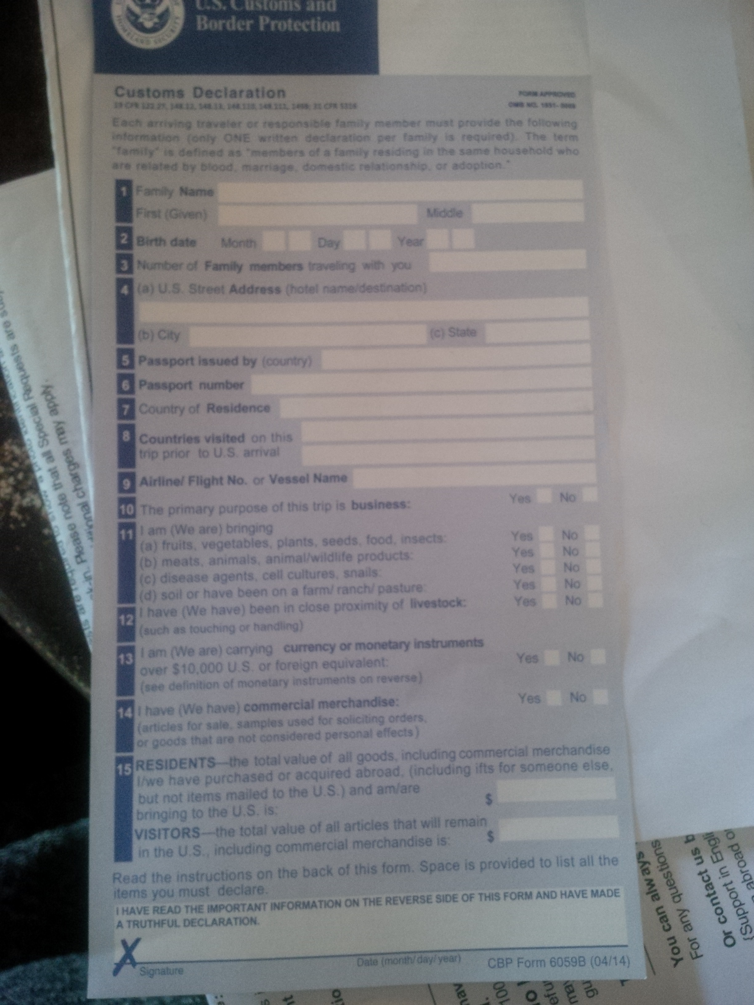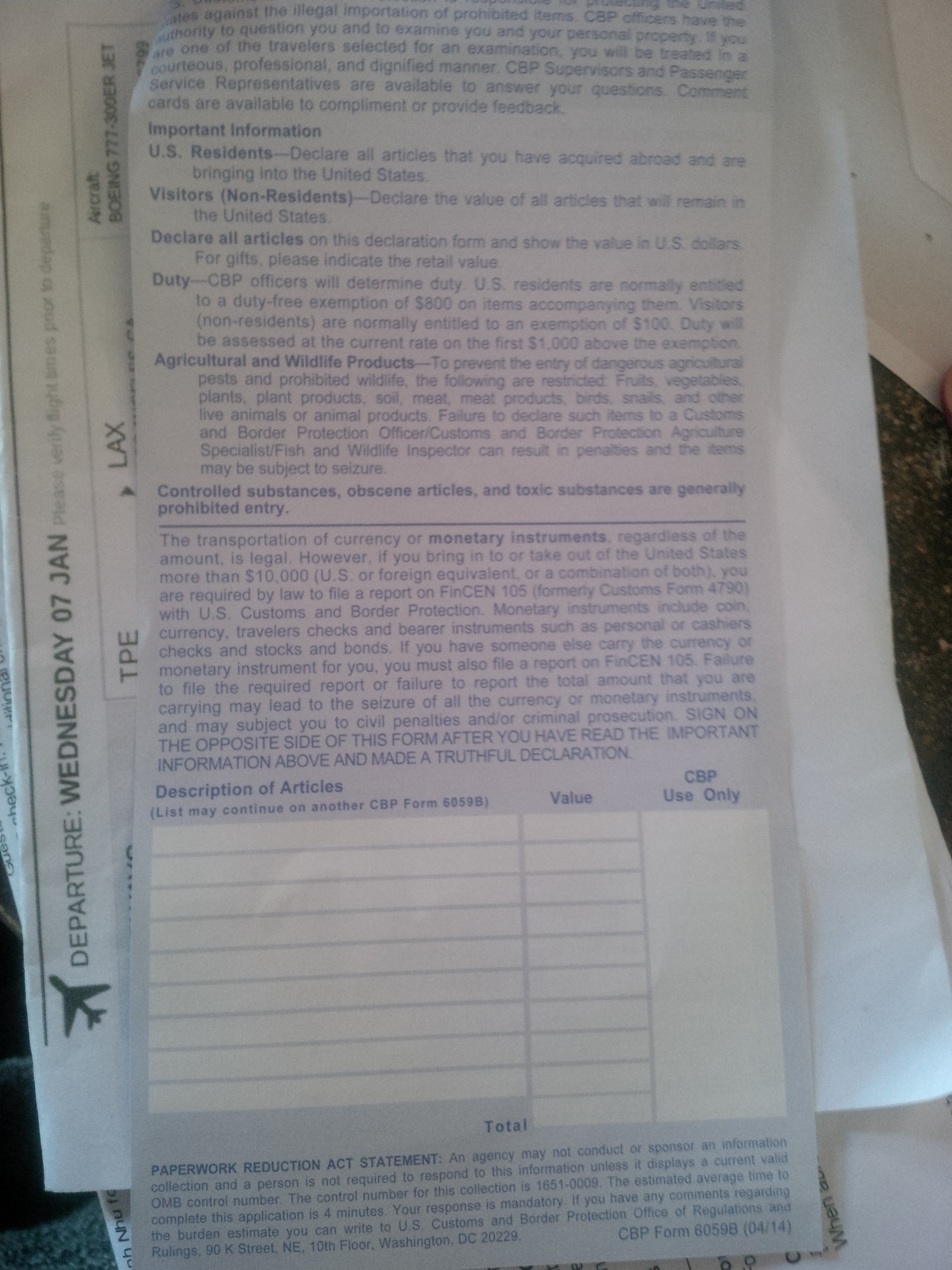 để viết thêm về vấn đề khai báo hải quan. cửa khẩu lax – phi trường tại los là một trong những cửa khẩu check in rất lâu. không giống như những đợt trước, phải điền I94, bây giờ, ngay trên máy bay đã được phát 1 tờ gọi là an ninh cửa khẩu. trong đó nội dung quan trọng là không mang bất kì cái gì có adn lên máy bay nhập cảnh vào mĩ, ví dụ, hạt giống, thuốc nam, hoặc trái cây, rau củ quả. tiền cũng được hỏi, và mục đích chuyến đi.