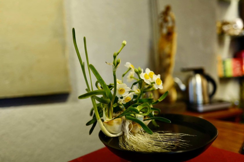 bức này do anh đi thưởng hoa thủy tiên mà có. hoa này mình được biết từ nguyễn tuân. cách viết của ông làm mình vấn vương rằng các cụ nhà ta đã có thú tao nhã như thế sao. từ củ cho đến bộ rễ, cuộn lá và hoa. cứ tựa như vụ cháy rừng ở úc bằng giọt sương đọng trên lá. rằng thì kính thưa các loại bụi trần, chúng em chỉ biết sinh ra đã đẹp chứ có nào biết ngoài vẻ đẹp trong lành và tinh khiết, nhẹ nhàng thổi vào không khí một nhánh hoa, một búp lá ra em còn phải biết đến bụi mịn, nồng độ xê ô hai tỏa ra trong bầu khí quyển là thể nào đâu. đối với chúng em chỉ có một thể, ấy là thể tự do xinh đẹp.